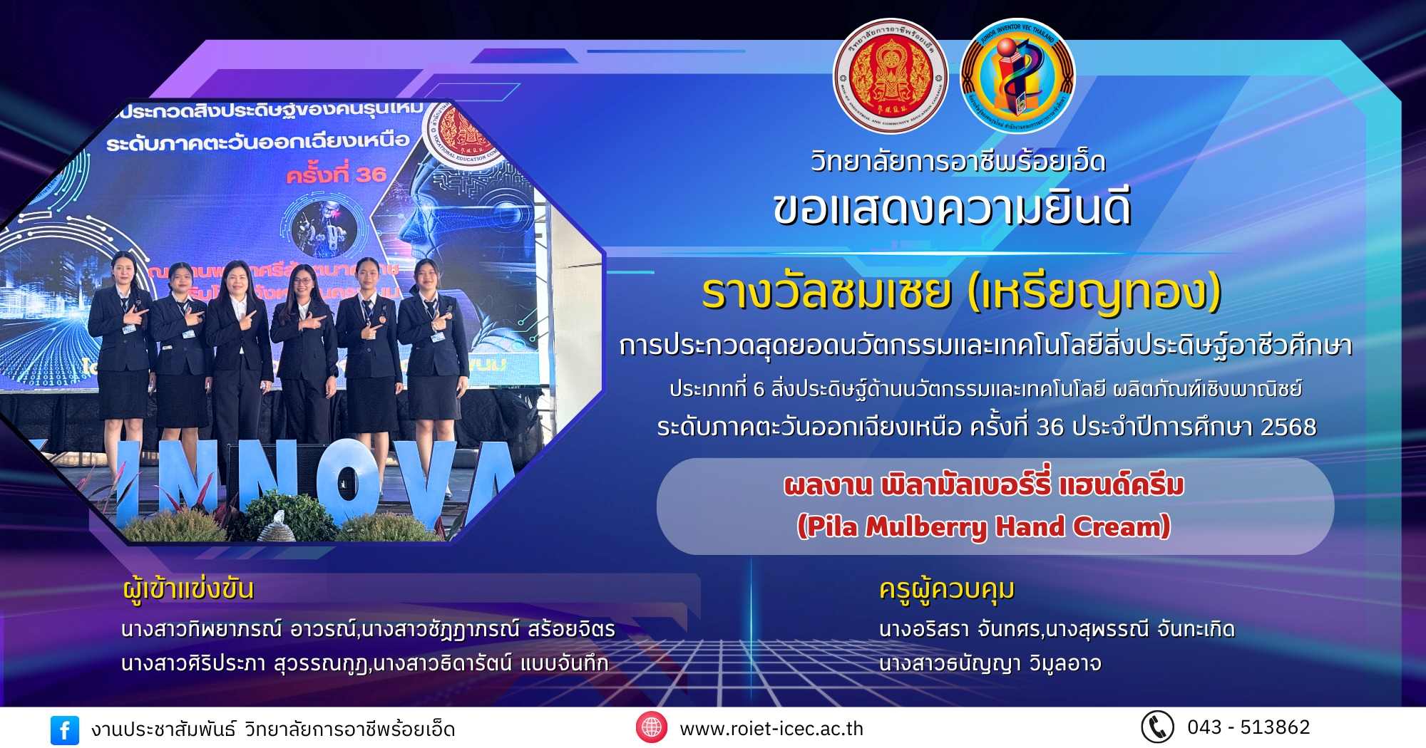 วิทยาลัยการอาชีพร้อยเอ็ด  ขอแสดงความยินดี รางวัลชมเชย (เหรียญเงิน)   ประเภทที่ 5 สิ่งประดิษฐ์ด้านนวัตกรรมและเทคโนโลยีเพื่อสุขภาพ (HeaIth Care)  ผลงาน ไฟสัญญาณสำหรับไม้เท้าผู้พิการทางสายตา  ขอแสดงความยินดี รางวัลชมเชย (เหรียญทอง)   ประเภทที่ 6 สิ่งประดิษฐ์ด้านนวัตกรรมและเทคโนโลยี ผลิตภัณฑ์เชิงพาณิชย์  ผลงาน พิลามัลเบอร์รี่ แฮนด์ครีม (Pila Mulberry Hand Cream)  การประกวดสุดยอดนวัตกรรมและเทคโนโลยี สิ่งประดิษฐ์อาชีวศึกษา ระดับภาคตะวันออกเฉียงเหนือ ครั้งที่ 36 ประจำปีการศึกษา 2568 ระหว่างวันที่ 28-30 พฤศจิกายน 2568 ณ ลานพญาศรีสัตนาคราช ริมโขง จังหวัดนครพนม |