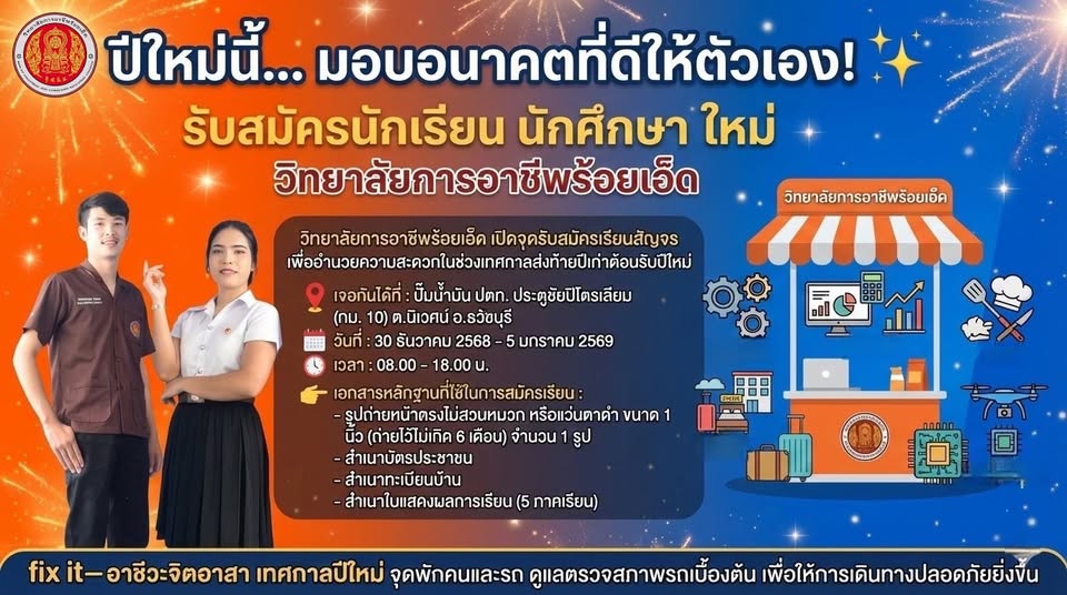 พิเศษ! พบกับกิจกรรม Fix it – อาชีวะจิตอาสา บริการจุดพักคนและพักรถ ตรวจสภาพรถเบื้องต้นฟรี! เพื่อความปลอดภัยในการเดินทางของทุกท่านตลอดเทศกาลปีใหม่นี้