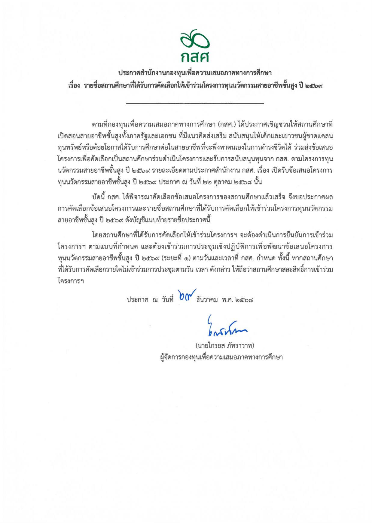 ขอแสดงความยินดี! วิทยาลัยการอาชีพร้อยเอ็ด ผ่านการคัดเลือกเข้าร่วมโครงการ "ทุนนวัตกรรมสายอาชีพชั้นสูง" ประจำปี ๒๕๖๙