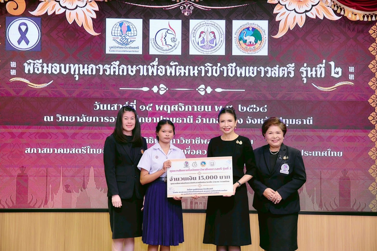 วันที่ 15 พฤศจิกายน 2568 นายสรพงษ์ แสนกล้า ผู้อำนวยการวิทยาลัยการอาชีพร้อยเอ็ด มอบหมายให้นางสาวจิรภา ยศปัญญา ผู้ช่วยหัวหน้างานแนะแนวอาชีพและการจัดหางาน พร้อมด้วยนางสาววิยะดา นนทภา นักเรียน แผนกวิชาช่างไฟฟ้า เข้าร่วมพิธีมอบทุนการศึกษาเพื่อพัฒนาวิชาชีพเยาวชนสตรี รุ่นที่ 2 ณ วิทยาลัยการอาชีวศึกษาปทุมธานี จังหวัดปทุมธานี