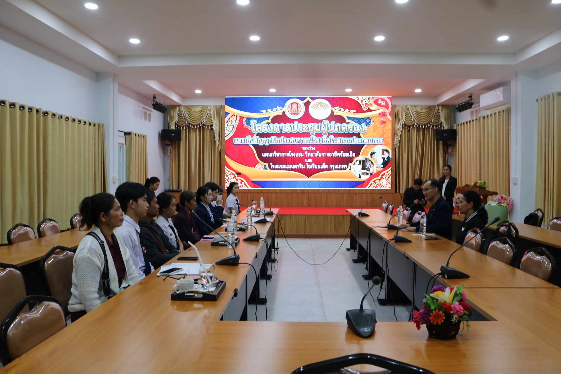 เข้าโครงการประชุมผู้ปกครองและเซ็นสัญญาฝึกประสบการณ์วิชาชีพในสถานประกอบการ ระหว่าง แผนกวิชาการโรงแรม วิทยาลัยการอาชีพร้อยเอ็ด และโรงแรมแมนดาริน โอเรียนเต็ล กรุงเทพมหานคร ในวันศุกร์ ที่ 12 ธันวาคม 2568 ณ ห้องเทคโนโลยีบัณฑิต (ห้องประชุมอินทนิล 3) วิทยาลัยการอาชีพร้อยเอ็ด