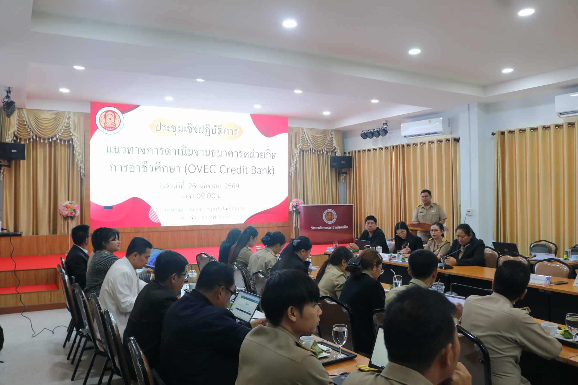 วันที่ 26 มกราคม 2569 สำนักงานอาชีวศึกษาจังหวัดร้อยเอ็ด จัดประชุมชี้แจงแนวทางดำเนินงานธนาคารหน่วยกิตการอาชีวศึกษา รูปแบบการศึกษาในระบบ การศึกษานอกระบบ และการศึกษาระบบทวิภาคี (Credit Bank) เพื่อให้สถานศึกษานำไปใช้แนวทางในการปฏิบัติได้อย่างมีคุณภาพมาตรฐานและนำไปใช้เป็นแนวทางทิศทางเดียวกัน โดยมีผู้เข้าร่วมประชุมทั้ง 8 สถานศึกษา ในสังกัดสำนักงานอาชีวศึกษาจังหวัดร้อยเอ็ด ประกอบไปด้วย รองผู้อำนวยการฝ่ายวิชาการ หัวหน้างานพัฒนาหลักสูตรการเรียนการสอน หัวหน้างานวัดผลและประเมินผล และหัวหน้างานทะเบียน ทั้งนี้นายสรพงษ์ แสนกล้า ผู้อำนวยการวิทยาลัยการอาชีพร้อยเอ็ด เป็นผู้กล่าวรายงาน และได้รับเกียรติจากว่าที่ร้อยโท สันติสุข โมฬา ผู้อำนวยการวิทยาลัยการอาชีพโพนทอง เป็นประธานในพิธีเปิดการประชุมครั้งนี้ ในวันจันทร์ ที่ 26 มกราคม 2569 ณ ห้องประชุม อาคารเทคโนโลยีบัณฑิต วิทยาลัยการอาชีพร้อยเอ็ด