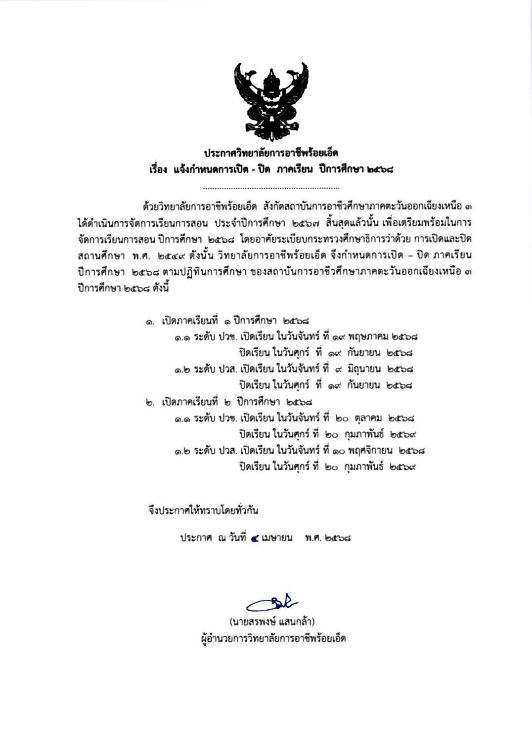 วิทยาลัยการอาชีพอาชีพร้อยเอ็ด ขอแจ้งกำหนดการเปิด-ปิด ภาคเรียน ปีการศึกษา 2568