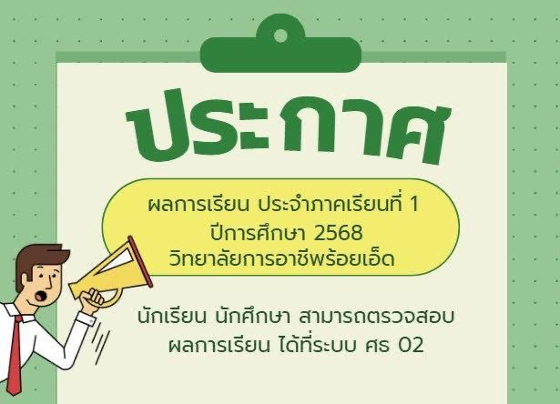วิทยาลัยการอาชีพร้อยเอ็ด ขอแจ้งว่า ผลการเรียนของนักเรียน นักศึกษา ภาคเรียนที่ 1 ปีการศึกษา 2568 ได้ประกาศเรียบร้อยแล้ว