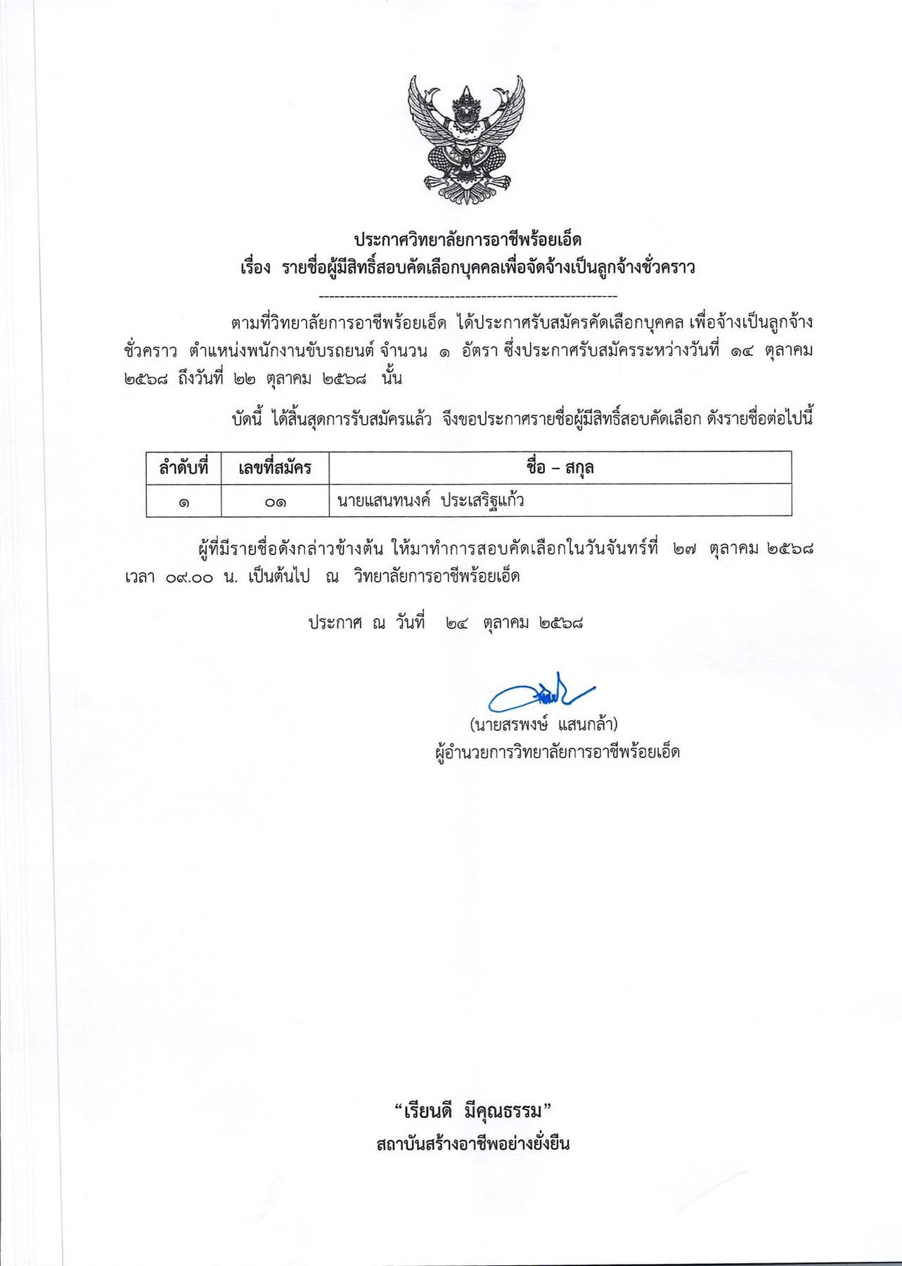 ประกาศรายชื่อผู้มีสิทธิ์สอบคัดเลือกบุคคลเพื่อจ้างเป็นลูกจ้างชั่วคราว ตำแหน่ง พนักงานขับรถยนต์ วิทยาลัยการอาชีพร้อยเอ็ด กำหนดวันสอบคัดเลือก: วันจันทร์ที่ 28 ตุลาคม 2567 เวลา: 09.00 น. เป็นต้นไป สถานที่: วิทยาลัยการอาชีพร้อยเอ็ด ขอให้ผู้มีสิทธิ์สอบมารายงานตัวก่อนเวลา และเตรียมเอกสารที่เกี่ยวข้องให้พร้อม ---------------------------------------- ติดตามข่าวสารของเราได้ที่ FB : ประชาสัมพันธ์ วิทยาลัยการอาชีพร้อยเอ็ด TikTok : pr.icec101 website : www.roiet-icec.ac.th #วิทยาลัยการอาชีพร้อยเอ็ด #101icec #ประชาสัมพันธ์วิทยาลัยการอาชีพร้อยเอ็ด #เรียนดีมีคุณธรรม #อาชีวะสร้างชาติ |
