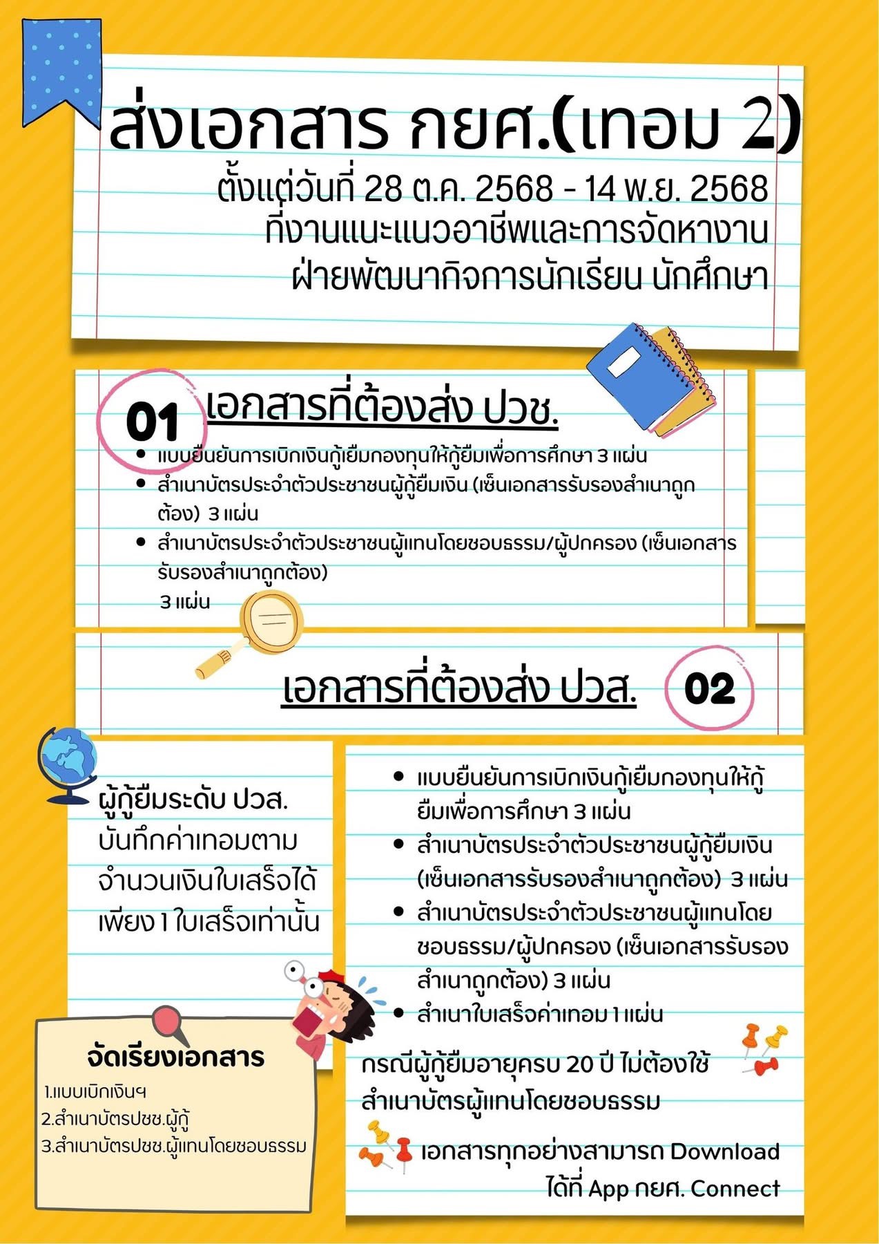 ประกาศ สำหรับผู้กู้ยืม กยศ. ในภาคเรียนที่ 2/2568 ให้ผู้กู้ยืมดำเนินการ ดังนี้ 1. ผู้กู้ยืมให้เข้าระบบ กยศ. เพื่อปริ้นแบบยืนยันการเบิกเงินกู้ยืม จำนวน 3 แผ่น ** ในขั้นตอนการเบิกเงินกู้ยืม ระดับปวช. ให้เลือกเฉพาะค่าครองชีพ ระดับปวส. หากผู้กู้มีความประสงค์จะเอาค่าเล่าเรียนด้วย ให้เลือกทั้งค่าเล่าเรียนและค่าครองชีพ กรณีไม่รับค่าเล่าเรียน ให้เลือกเฉพาะค่าครองชีพ 2. การกรอกข้อมูล และการลงลงลายมือชื่อ 2.1 วันที่ออกบัตร-หมดอายุบัตรประชาชน ตัวบรรจง เช่น 1 ก.ค. 65, 1/7/65 เป็นต้น 2.2 วันที่ทำสัญญา และภาคเรียน >>> #ไม่ต้องกรอกข้อมูล 2.3 การลงลายมือชื่อผู้กู้ยืม ลงลายมือชื่อด้วยตนเองต่อหน้าพยาน 2.4 การลงลายมือชื่อผู้แทนโดยชอบธรรม/ผู้ปกครอง - ผู้แทนโดยชอบธรรม/ผู้ปกครอง ลงลายมือชื่อเฉพาะผู้ที่ ปรากฏชื่อในเอกสารแบบยืนยันฯ ลงลายมือชื่อด้วยตนเองเท่านั้น หรือ กรณีผู้กู้ยืมที่อายุไม่ถึง 20 ปีบริบูรณ์ (ช่องพยานไม่ต้องลงนาม) หมายเหตุ : การกรอกข้อมูล และการลงลงลายมือชื่อ 1. การลงลายมือชื่อต้องตรงกันทุกจุดในเอกสารทุกฉบับ 2. ห้ามผู้กู้ยืมเงินหรือบุคคลอื่นลงลายมือชื่อแทนผู้แทนโดยชอบธรรม/ผู้ปกครอง หรือพยาน (ถือเป็นความผิดทาง วินัยนักศึกษา และอาจไม่ได้กู้ยืมเงินหากตรวจพบภายหลัง) 3. ห้ามใช้น้ำยาลบคำผิด หรือขีดฆ่าในสำเนาบัตรประชาชน 4. กรณีกรอกข้อมูลผิด ห้ามใช้น้ำยาลบคำผิด ให้ปริ้นเอกสารเขียนใหม่ 5. กรอกข้อมูล โดยใช้ปากกาสีน้ำเงิน 6. ผู้กู้ยืมบันทึกค่าเทอมตามจำนวนเงินใบเสร็จได้เพียง 1 ใบเสร็จเท่านั้น 4. การจัดส่งเอกสารให้สถานศึกษา สามารถจัดส่งเอกสารได้ 2 ช่องทาง ดังนี้ 4.1 ให้เฉพาะผู้กู้นำเอกสารมาส่ง ณ ฝ่ายพัฒนากิจการนักเรียน นักศึกษา ที่ชั้น 2 ตึกอำนวยการ 4.2 จัดส่งทางไปรษณีย์ EMS จัดส่งไปรษณีย์ไทยเท่านั้น 5. กรณี ปวส. ประสงค์ค่าเทอม ให้ปริ้นเอกสาร KTB จำนวน 1 แผ่น และกรอกข้อมูลให้ครบถ้วน เเละสำเนาหน้าสมุดบัญชี 1 แผ่น ลงลายมืชื่อให้ถูกต้อง พร้อมทั้งสำเนาบัตรปชช. 1 แผ่น เว็นสำเนาถูกต้องให้ครบถ้วน (check mark) เอกสารแบบเเจ้งข้อมูลการโอนผ่านระบบ KTB https://drive.google.com/.../1xtRmRQQ0sZCyu41.../view... ที่อยู่การจัดส่ง งานกยศ.วิทยาลัยการอาชีพร้อยเอ็ด 177 ถ.รณชัยชาญยุทธ ต.ในเมือง อ.เมือง จ.ร้อยเอ็ด 45000 โทร. 096-424-4963 (วงเล็บมุมซองว่า "เอกสาร กยศ.") ***นำส่งเอกสาร ภายในวันที่ 14 พฤศจิกายน 2568 เวลา 16.00 น. *** ค่ะ |