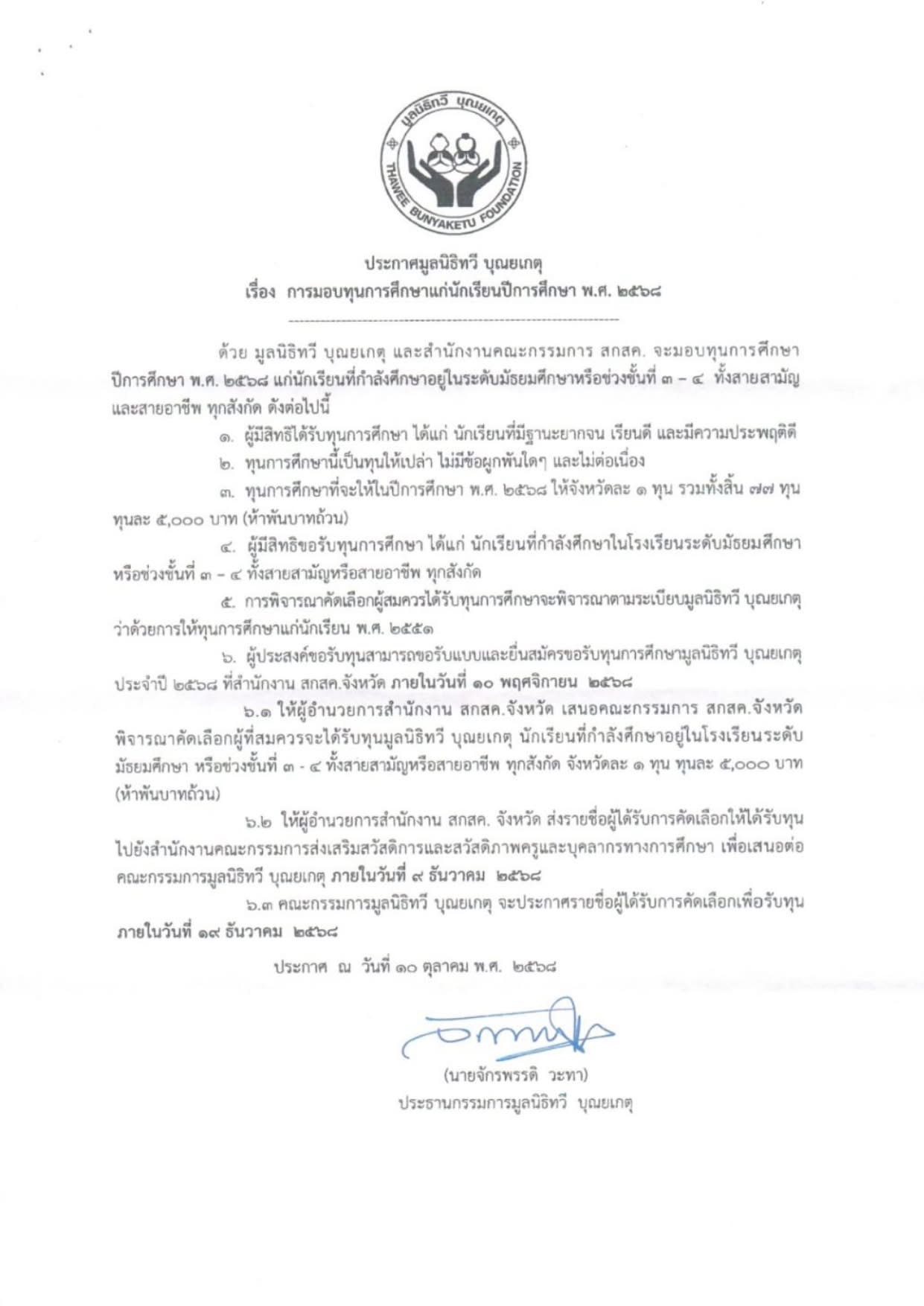 ประชาสัมพันธ์ ทุนการศึกษา มูลนิธิทวี บุณยเกตุ ทั้งสายสามัญและสายอาชีพ โดยมูลนิธิทวี บุณยเกตุ จะให้ทุนการศึกษา ปีการศึกษา 2568 แก่นักเรียนที่เรียนดีมีความประพฤติดีซึ่งกำลังศึกษาในระดับมัธยมศึกษา หรือช่วงชั้นเรียนที่ 3 - 4 ทั้งสายสามัญและสายอาชีพ มูลค่าทุนละ 5,000 บาท เป็นทุนให้เปล่าไม่มีข้อผูกพันใดๆ และไม่ต่อเนื่อง