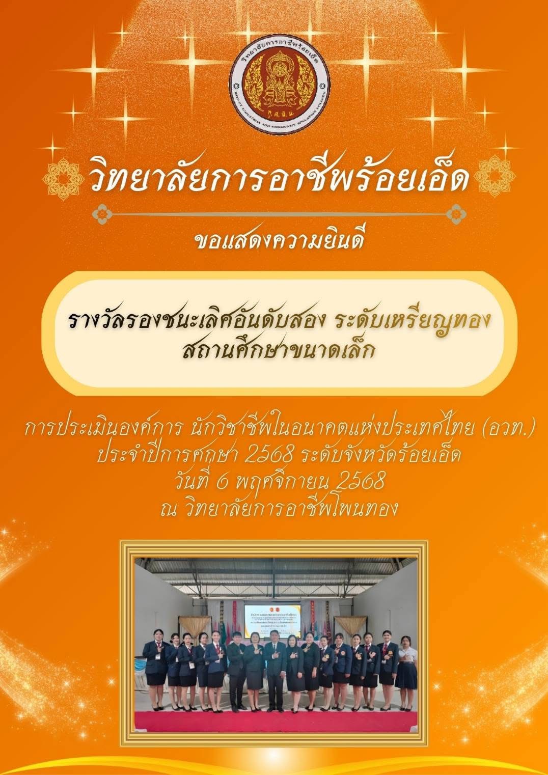 วิทยาลัยการอาชีพร้อยเอ็ด ขอแสดงความยินดีกับ องค์การนักวิชาชีพในอนาคตแห่งประเทศไทย วิทยาลัยการอาชีพร้อยเอ็ด ได้รับรางวัลรองชนะเลิศ อันดับสอง สถานศึกษาขนาดเล็ก การประเมินองค์การมาตรฐานดีเด่น (อวท.) ประจำปีการศึกษา 2568 ระดับจังหวัดร้อยเอ็ดวันที่ 5 พฤศจิกายน 2568 ณ วิทยาลัยการอาชีพโพนทอง |