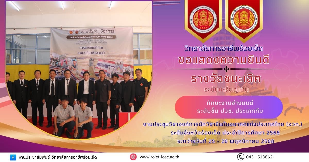 วิทยาลัยการอาชีพร้อยเอ็ด ขอแสดงความยินดี รางวัลชนะเลิศ การแข่งขันทักษะวิชาชีพและทักษะพื้นฐาน ระดับจังหวัดร้อยเอ็ด ประจำปีการศึกษา 2568
