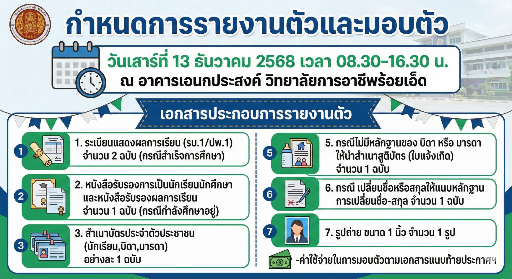 ประกาศรายชื่อผู้มีสิทธิ์รายงานตัวเข้าศึกษา ปีการศึกษา 2569 (รอบโควตา) วิทยาลัยการอาชีพร้อยเอ็ด
