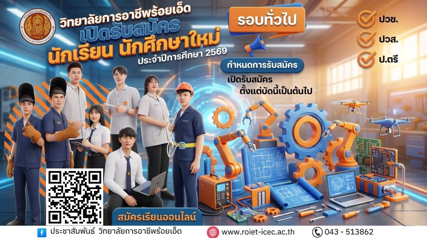 วิทยาลัยการอาชีพร้อยเอ็ด เปิดรับสมัครนักเรียน นักศึกษาใหม่ ประจำปีการศึกษา 2569 (รอบทั่วไป)