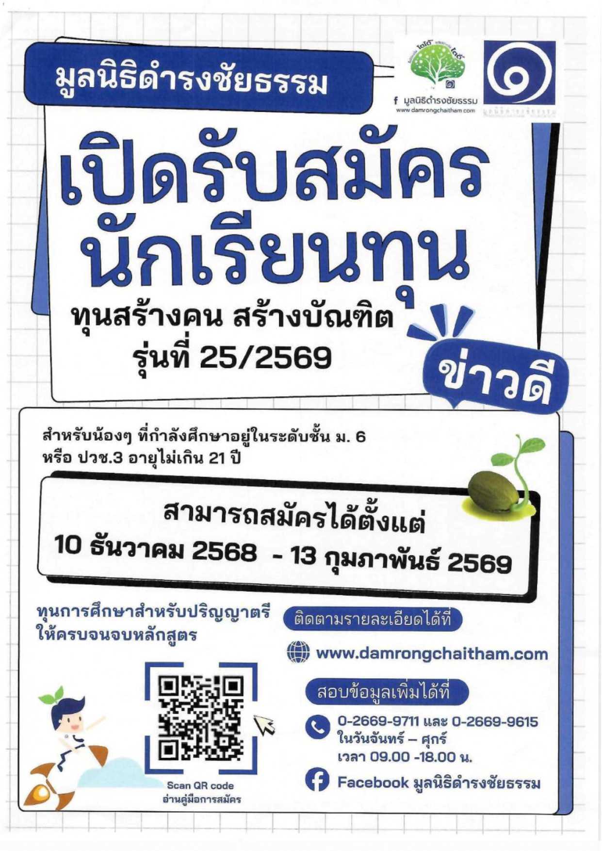 ประชาสัมพันธ์ทุนการศึกษาน้องๆนักเรียน ปวช.3 ที่สนใจสมัครทุนการศึกษา มูลนิธิดำรงชัยธรรม เปิดรับสมัครนักเรียนทุน "ทุนสร้างคน สร้างบัณฑิต รุ่นที่ 25/2569"