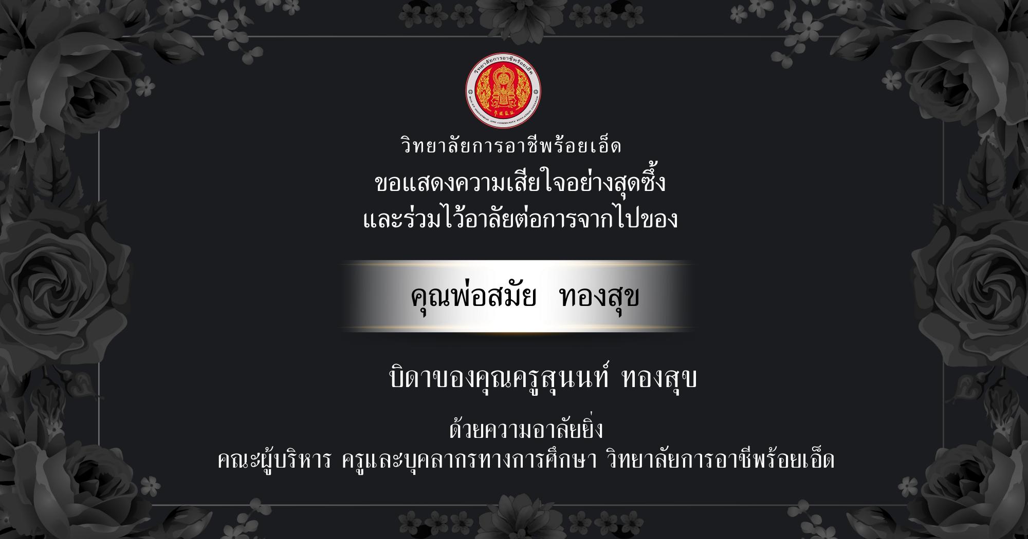 วิทยาลัยการอาชีพร้อยเอ็ด ขอแสดงความเสียใจและร่วมไว้อาลัยต่อการจากไปของ "คุณพ่อสมัย ทองสุข"