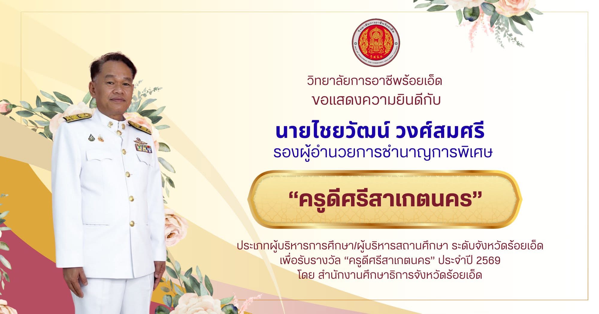 วิทยาลัยการอาชีพร้อยเอ็ด ขอแสดงความยินดีกับ นายไชยวัฒน์ วงศ์สมศรี รองผู้อำนวยการชำนาญการพิเศษ ได้รับรางวัล "ครูดีศรีสาเกตนคร" ประเภทผู้บริหารการศึกษา/ผู้บริหารสถานศึกษา ระดับจังหวัดร้อยเอ็ดเพื่อรับรางวัล “ครูดีศรีสาเกตนคร” ประจำปี 2569 โดย สำนักงานศึกษาธิการจังหวัดร้อยเอ็ด ---------------------------------------- ติดตามข่าวสารของเราได้ที่ FB : ประชาสัมพันธ์ วิทยาลัยการอาชีพร้อยเอ็ด TikTok : pr.icec101 website : www.roiet-icec.ac.th #วิทยาลัยการอาชีพร้อยเอ็ด #101icec #ประชาสัมพันธ์วิทยาลัยการอาชีพร้อยเอ็ด #เรียนดีมีคุณธรรม #อาชีวะสร้างชาติ |