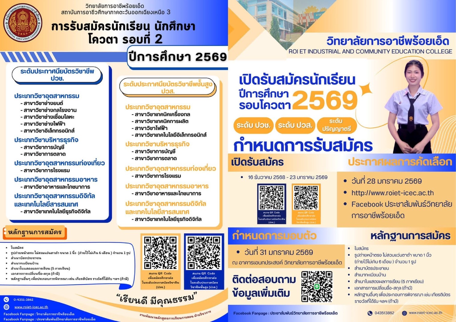 วิทยาลัยการอาชีพร้อยเอ็ด เปิดรับสมัครนักเรียน นักศึกษา รอบโควตา รอบที่ 2