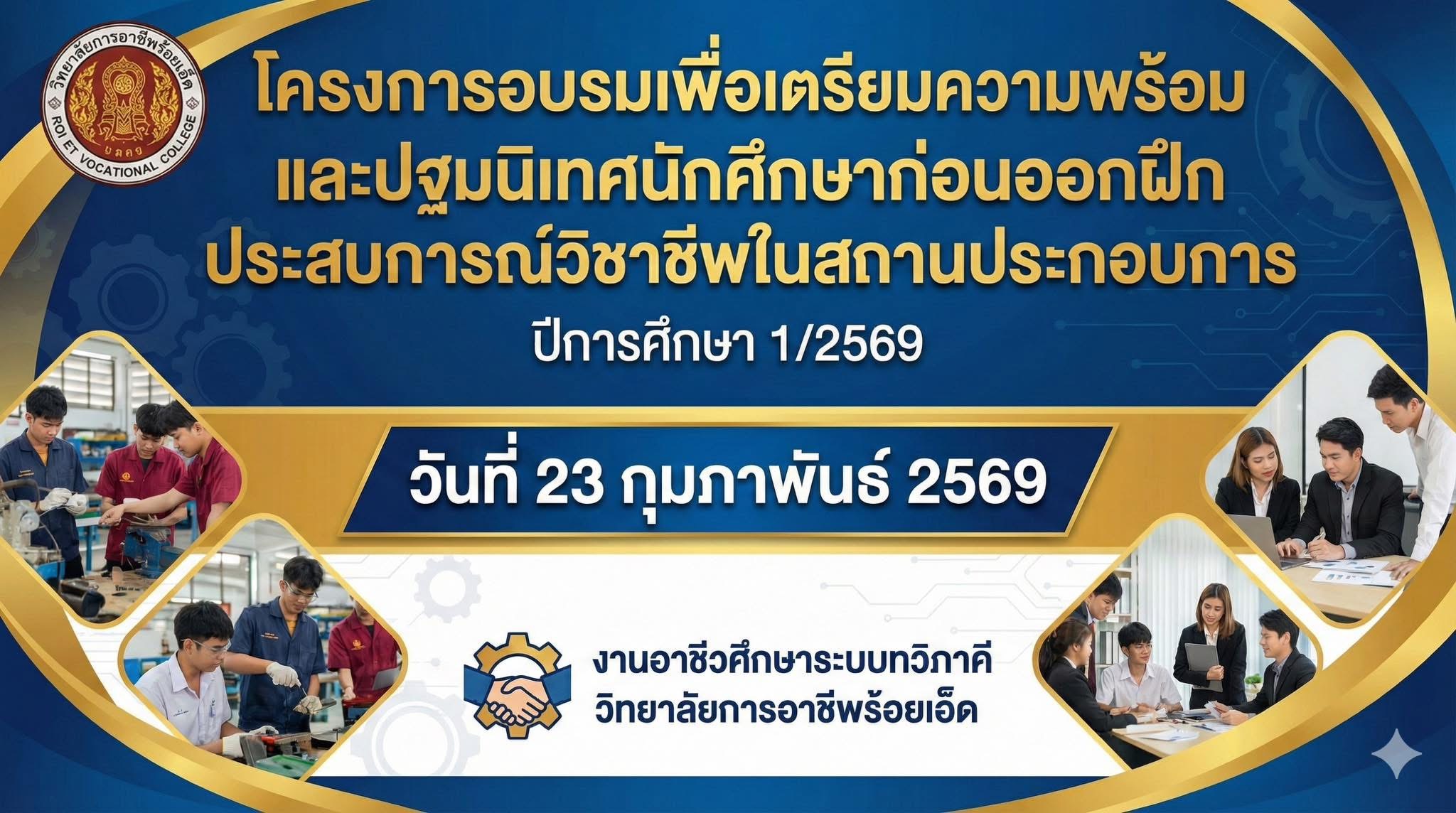 ขอเชิญชวนคณะผู้บริหาร ครูและบุคลากรทางการศึกษาเข้าร่วมโครงการอบรมเพื่อเตรียมความพร้อมและปฐมนิเทศนักศึกษาก่อนออกฝึกประสบการณ์วิชาชีพในสถานประกอบการ ประจำภาคเรียนที่ 1/2569  เพื่อเสริมสร้างความรู้ ทักษะ และทัศนคติที่ดีในการทำงานจริงอันเป็นการเตรียมความพร้อมให้นักศึกษาสามารถก้าวสู่โลกอาชีพอย่างมีคุณภาพและมั่นใจ