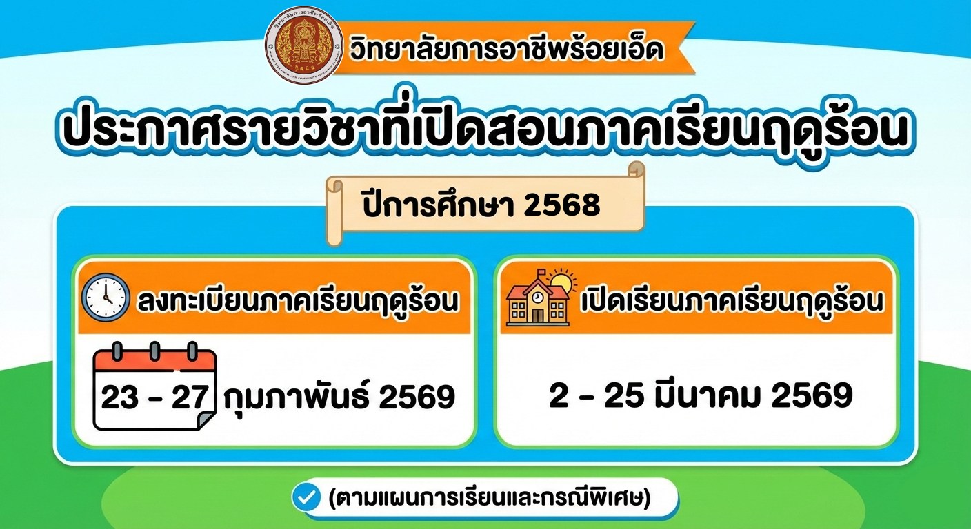 ประกาศรายวิชาที่เปิดสอนภาคเรียนฤดูร้อน วิทยาลัยการอาชีพร้อยเอ็ด